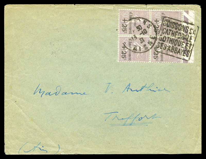 2663 imageN°276, Caisse d'amortissement +25c sur 50c violet en bloc de quatre bdf sur lettre de SOISSON le 13.10.31. TTB (certificat) Qualité: Oblitéré (Image) (image2) (All Images)