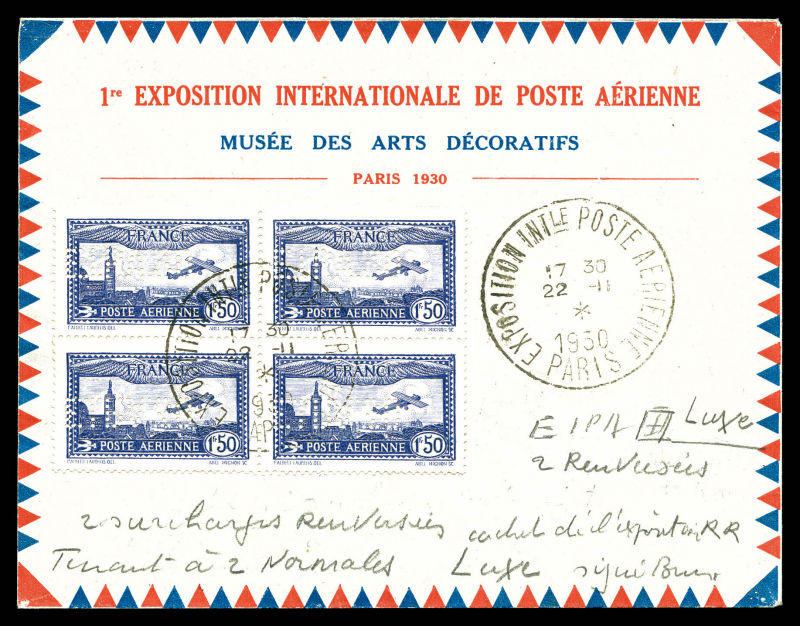2666 imageN°6, 1F50 outremer perforé 'E.I.P.A.30': 2 exemplaires perforations renversées tenant à normaux en bloc de quatre sur lettre de l'exposition, très jolie pièce. SUP (signé Brun/certificat) Qualité: Oblitéré (Image)