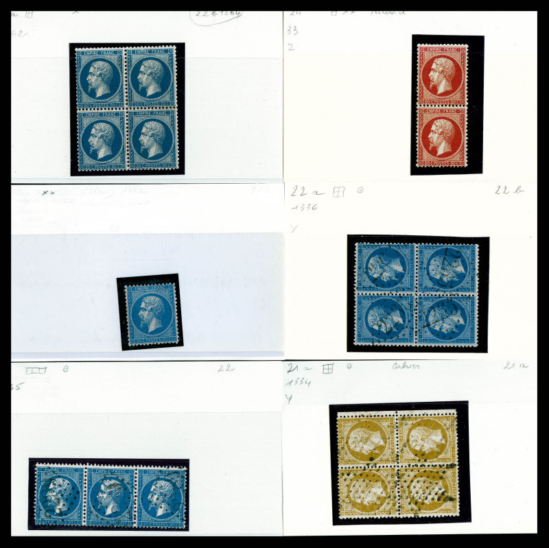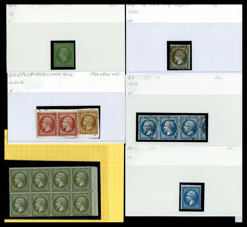 2675 image1862, Empire dentelé: petit stock sur cartes de timbres neufs et oblitérés, de bonnes valeurs dont 20c en paire tête-bêche, n°24 en paire neuve** (signée), n°19 en bloc de huit neuf **, des blocs de 4, oblitérations, surchargés SPECIMEN, bandes... A ETUDIER !! Qualité: N&Obl (Image) (image2) (image3) (image4) (All Images)