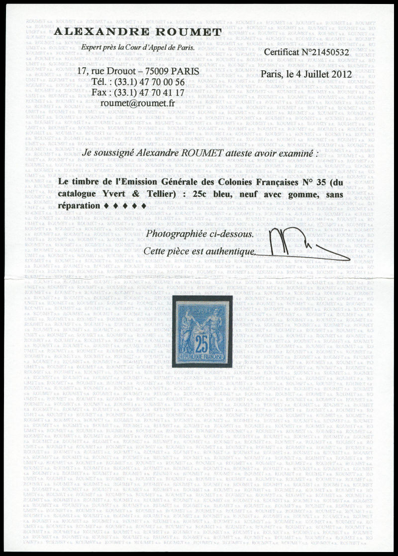 2773 imageN°35, 25c bleu, quatre belles marges, fraîcheur postale. SUP. R. (signé Calves/certificats) Qualité: * Cote: 5500 euros (Image) (image2) (All Images)