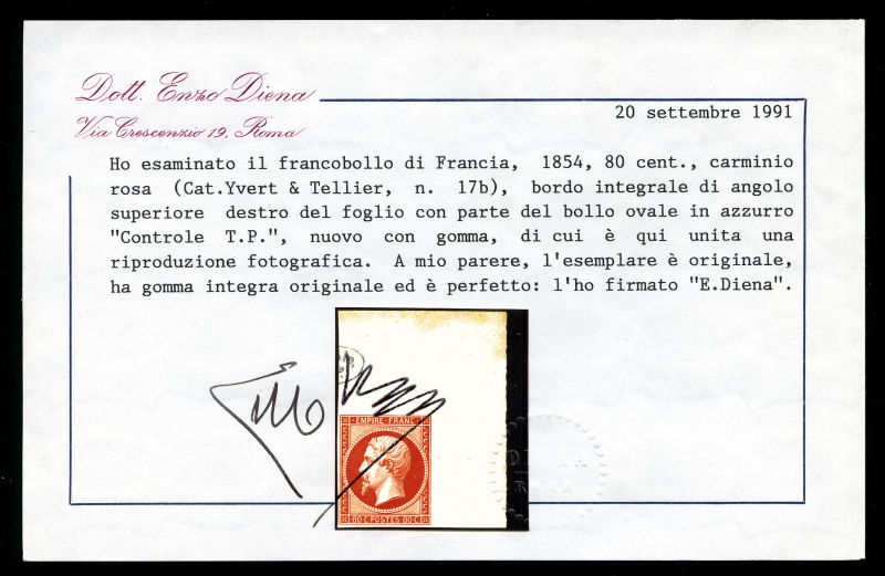 carmin, impression de 1862, coin de feuille intégral avec partie du cachet de contrôle TP bleu, fraîcheur postale. SUPERBE (certificats) Qualité: ** (Image) (image2)