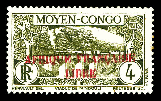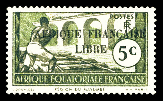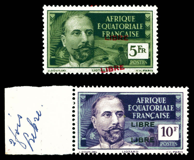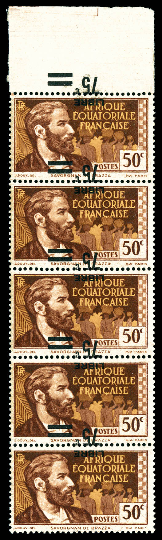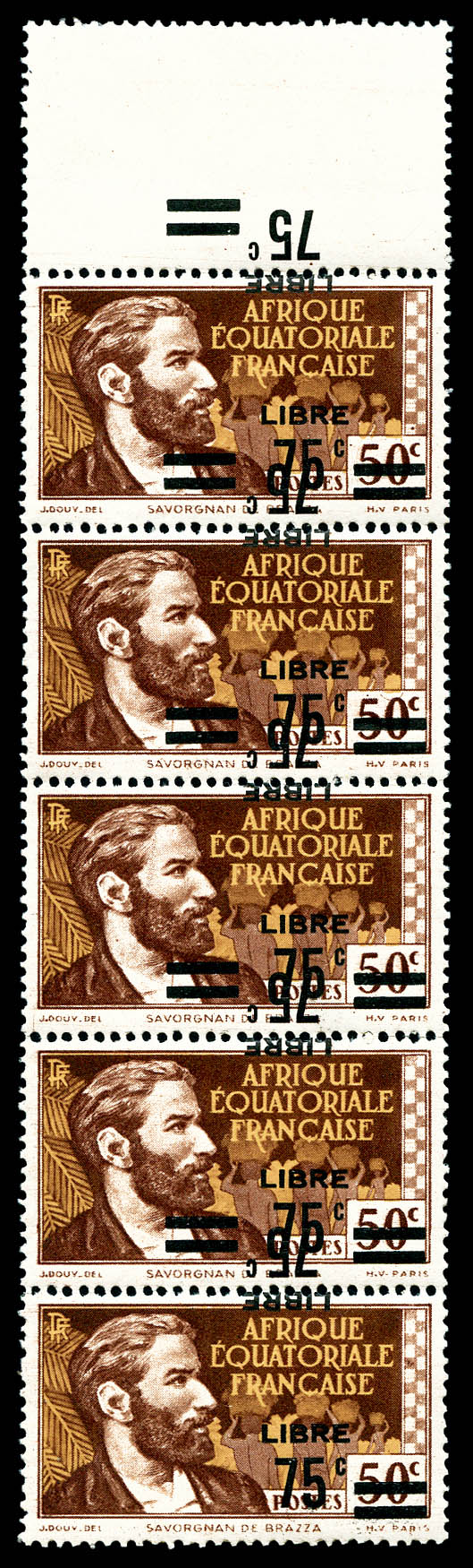 France-Libre. Surcharge renversée et à cheval en bande verticale de 5 exemplaires bdf dont un timbre sans surcharge, gomme coloniale, SUPERBE. R. (certificat) Qualité: **