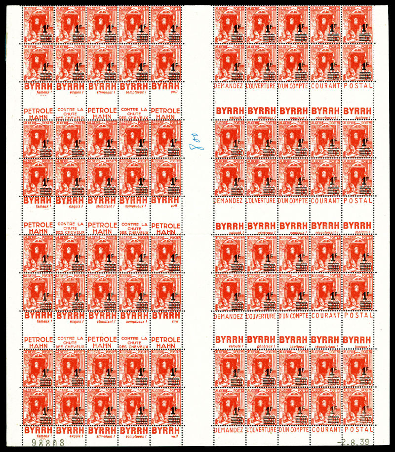 2903 imageN°158A-C1, 1F sur 90c Rue de la Casbah: feuille entière de 4 carnets avec publicités, daté du 2/8/39 (au lieu du 22/8/39, erreur de date, carnet non émis. TTB. R.R. (certificat) Qualité: ** Cote: 2640 euros (Image)