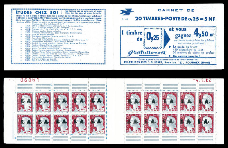 2912 imageN°355-C2, Série 4-62, Couverture 3 SUISSES, surcharge départementale d'ALGER (type 1-12), oblitération aux 2 angles du 4.7.62 et dignature Décaris sur l'interpanneau. TTB. R. (certificat) Qualité: ** (Image)
