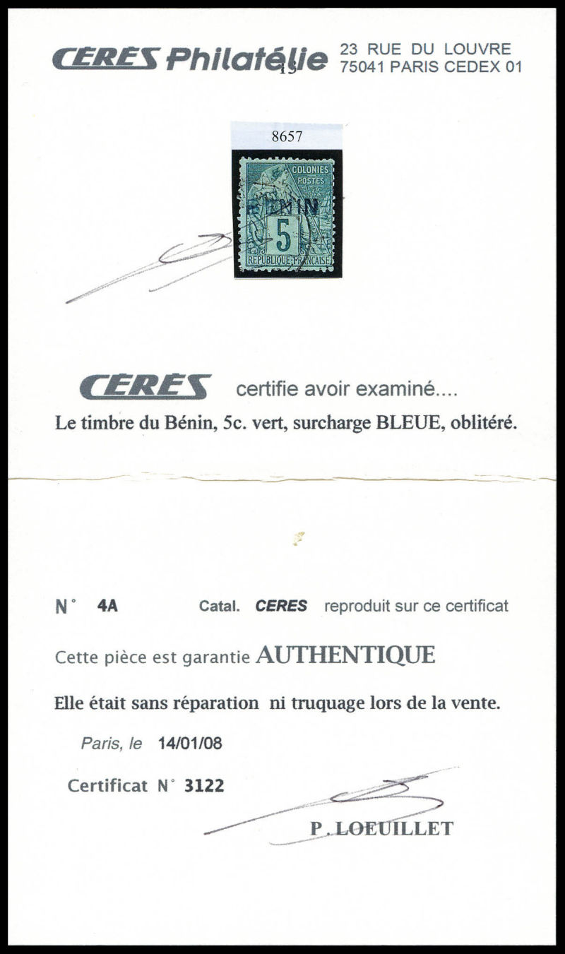 2919 imageN°6A, 15c bleu surcharge BENIN bleue, TTB. R. (signé Calves/certificat) Qualité: Oblitéré Cote: 1550 euros (Image) (image2) (All Images)