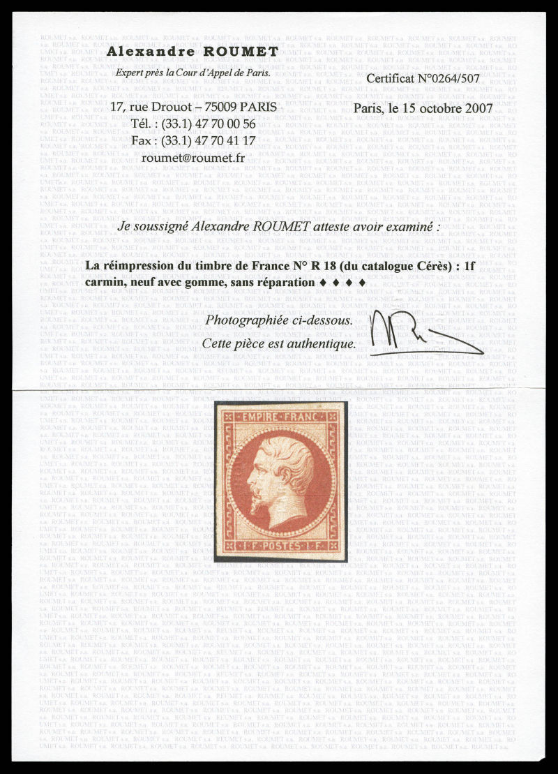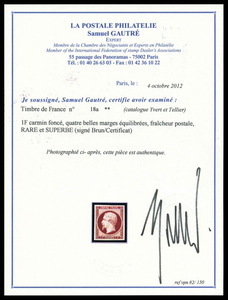 287 imageN°18d, 1F carmin, impression de 1862, TB (certificats) Qualité: * Cote: 2500 euros (Image) (image2) (All Images)
