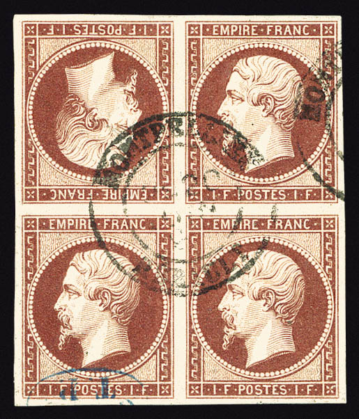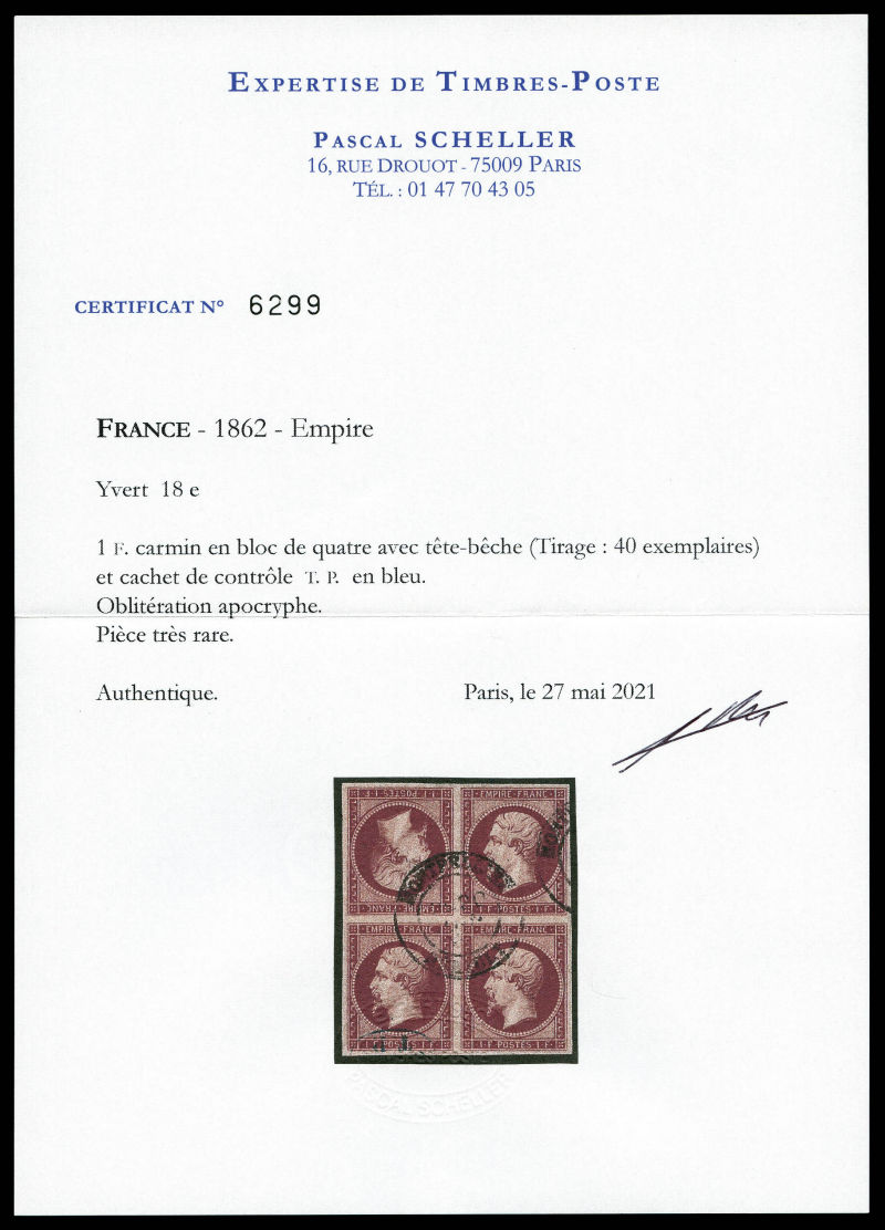 288 imageN°18e, 1F carmin impression de 1862, TÊTE-BÊCHE tenant à normaux dans un bloc de quatre, oblitération apocryphe, cachet de contrôle TP en bleu, fraîcheur postale, GRANDE RARETE DE LA PHILATELIE FRANCAISE (certificats) Qualité: Oblitéré (Image) (image2) (All Images)