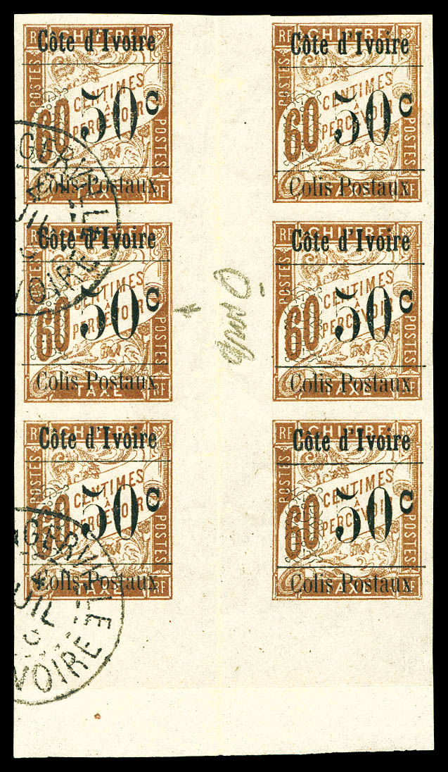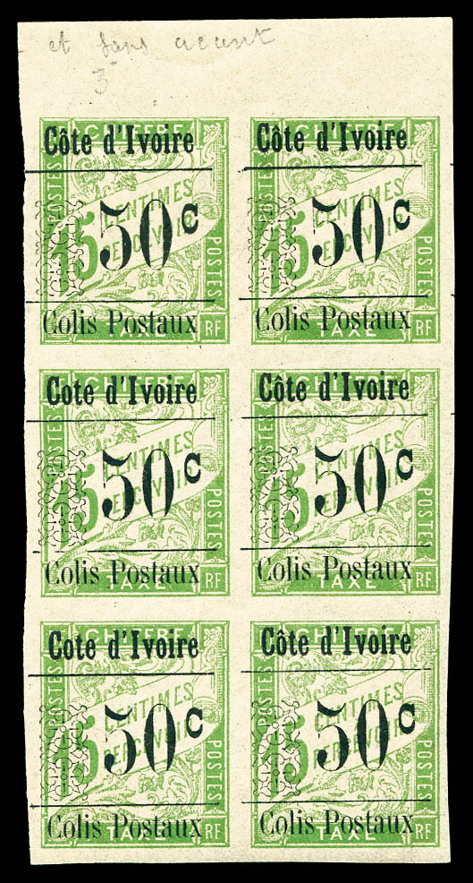 15c vert: 2 ex sans accent circonflexe sur le 'o' de Côte tenant à normaux dans un bloc de 6 bdf. TTB Qualité: ** Cote: 444 euros (Image)