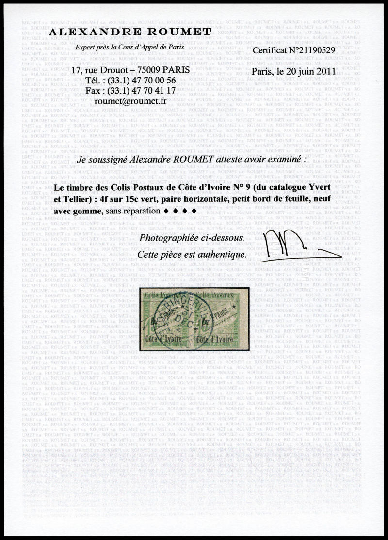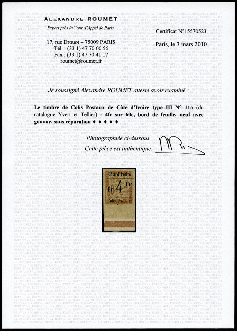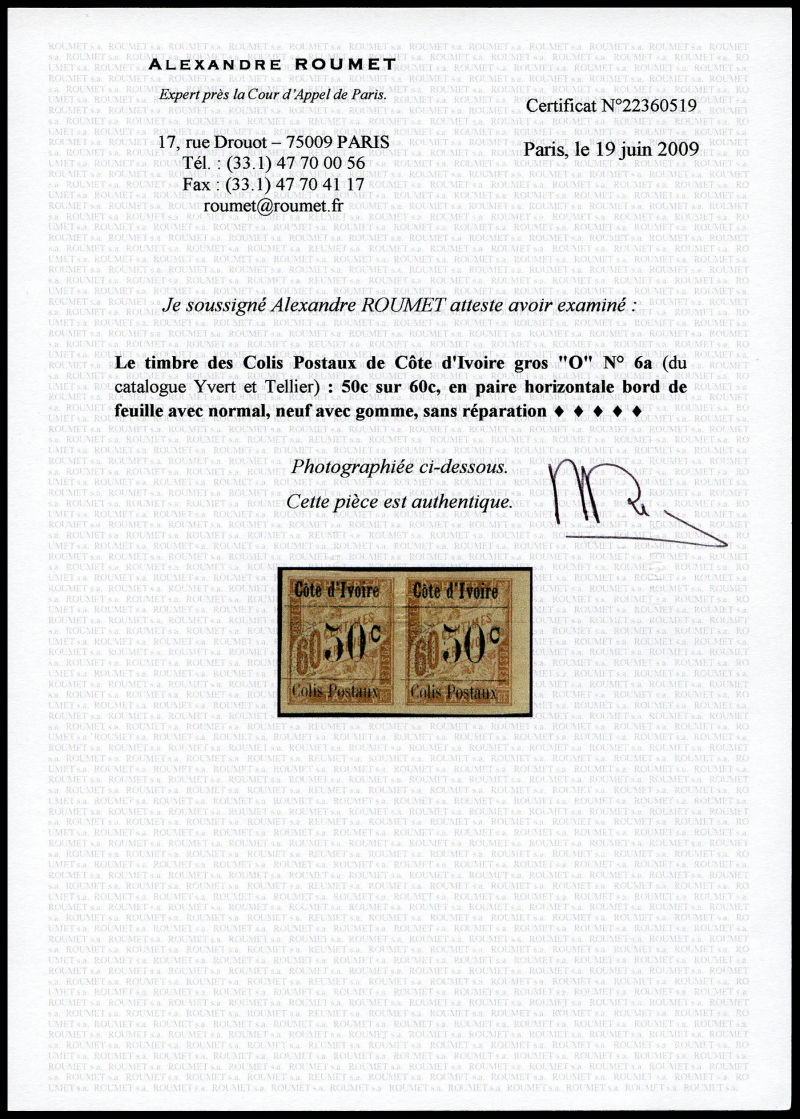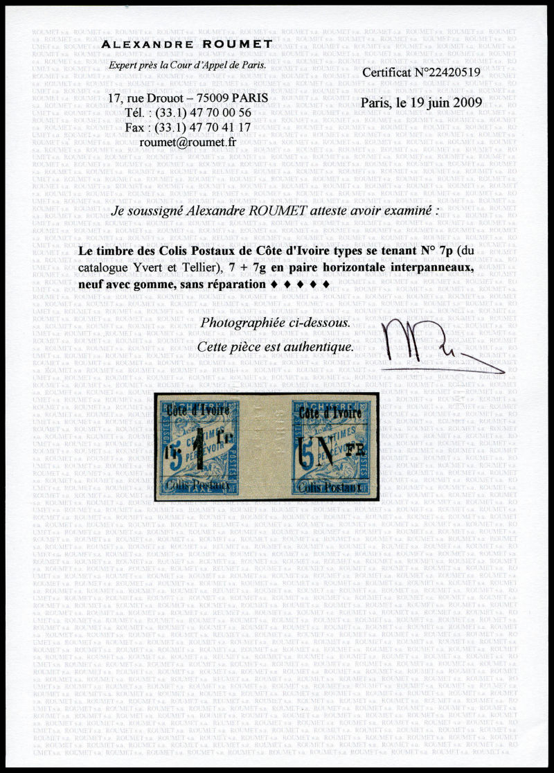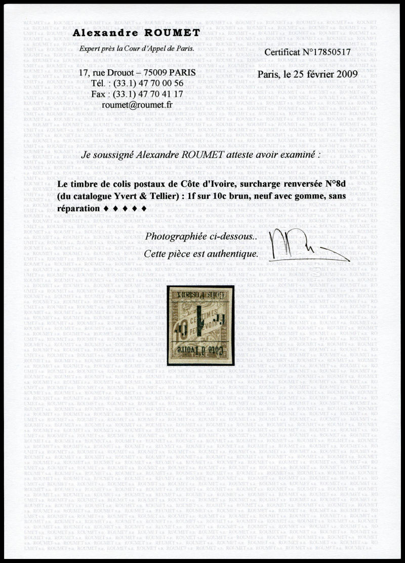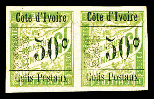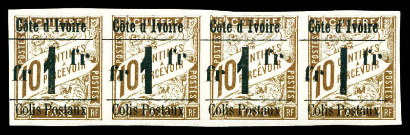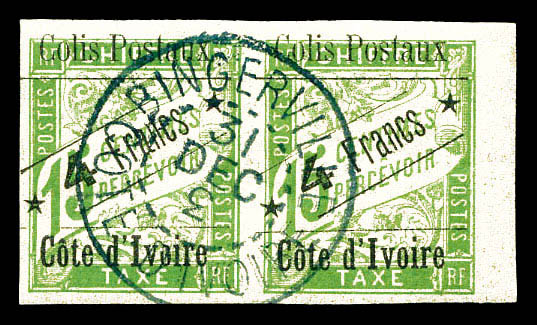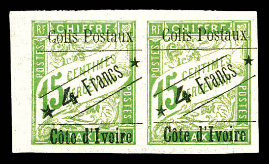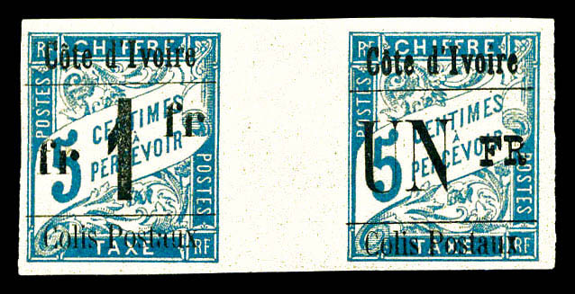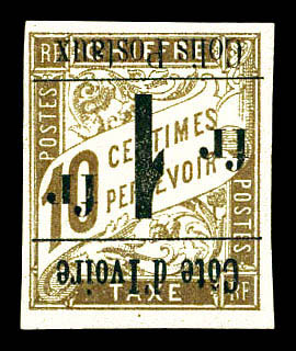 sur 10c brun: type I sans accentcirconflexe sur le 'o' de Côte tenant à 2 ex normaux à gauche et 1 ex type II à droite. TTB (certificat) Qualité: ** Cote: 500 euros