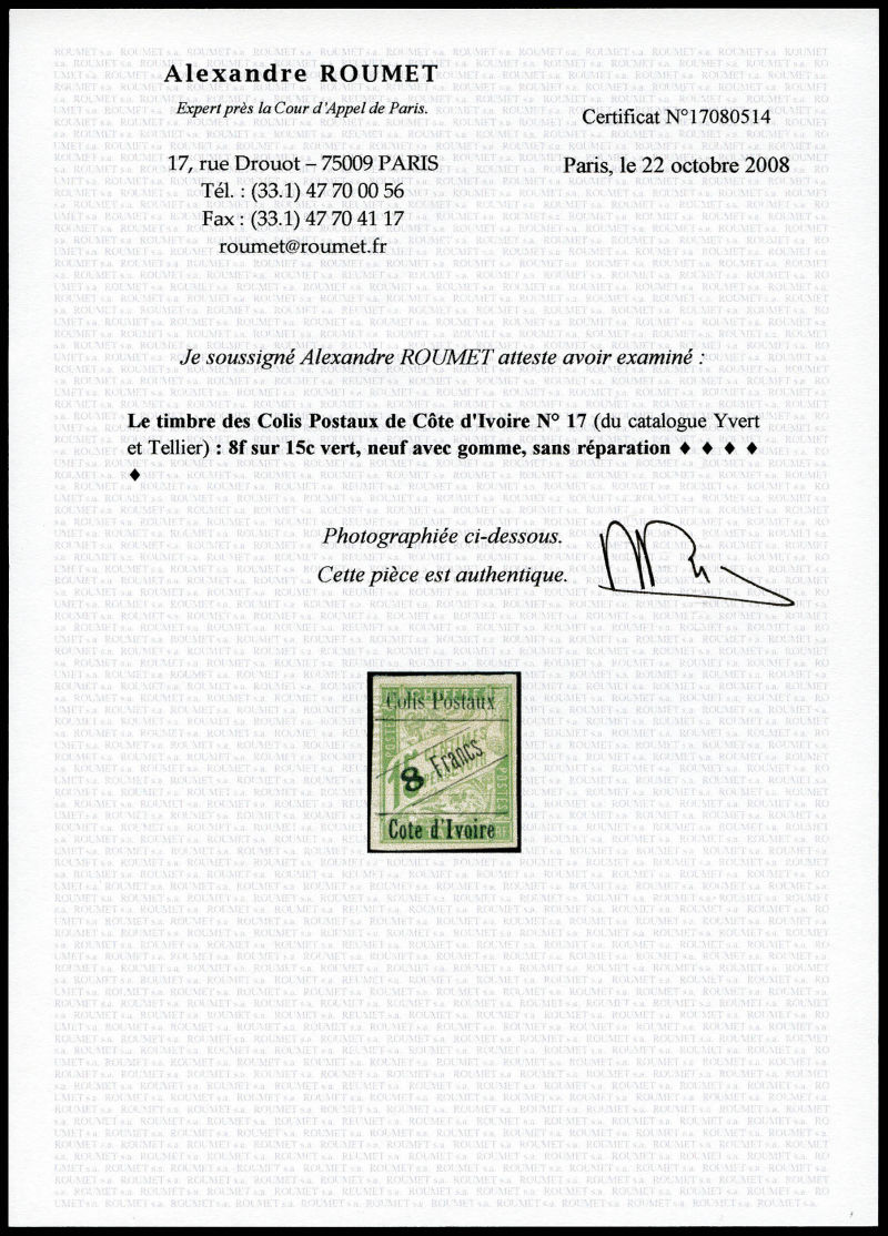 3086 imageN°17, 8f sur 15c vert. TB (signé Calves/certificats) Qualité: * Cote: 375 euros (Image) (image2) (All Images)