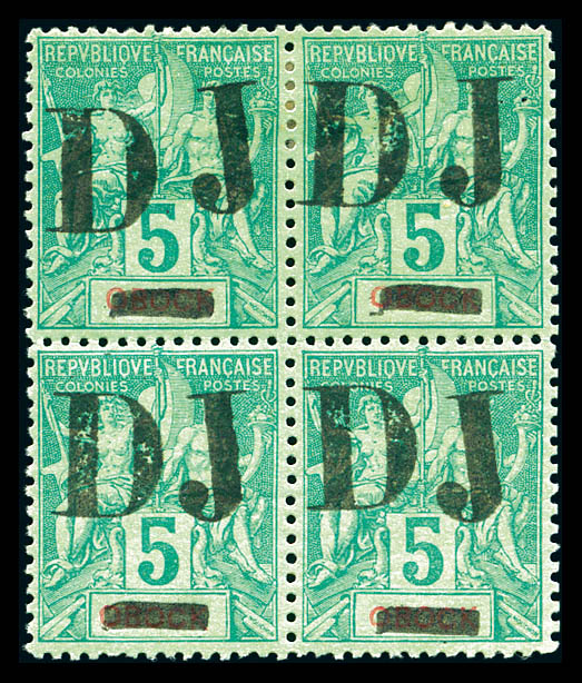 3094 imageN°1, 5c vert avec OBOCK barré, bloc de quatre (2ex*), très bon centrage. SUP (signé Brun/Certificat) Qualité: ** Cote: 1680 euros (Image)