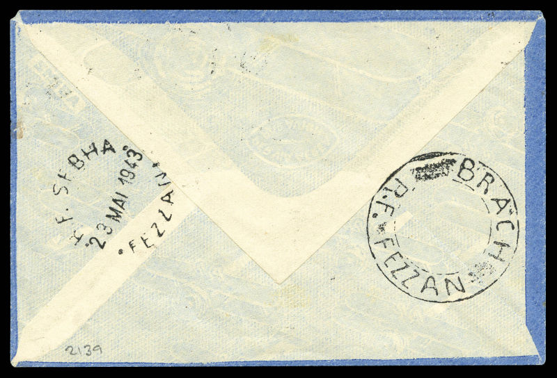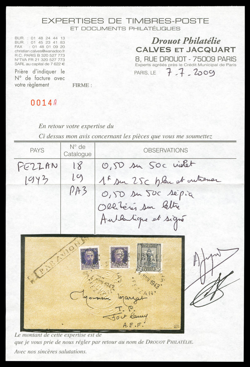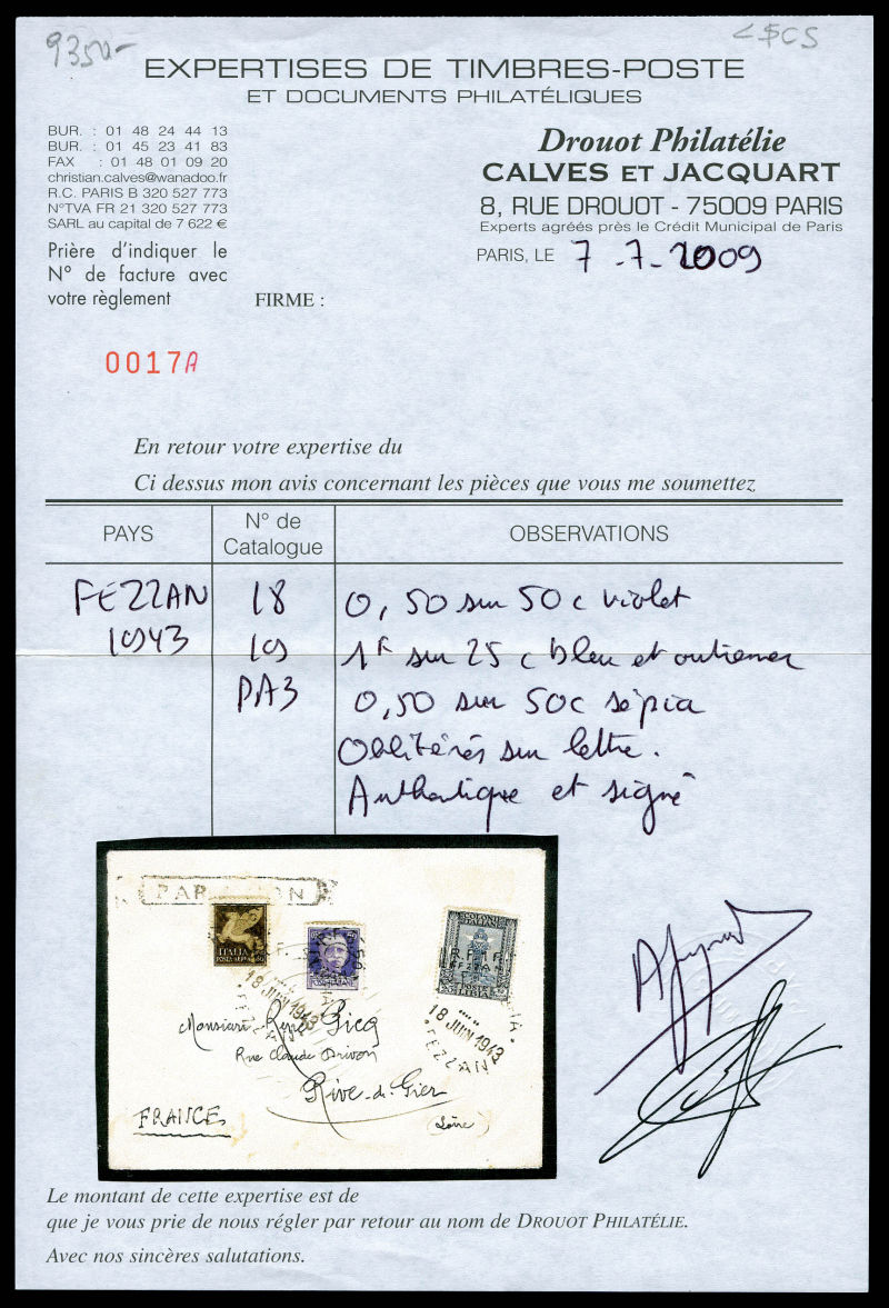 3159 image50 sur 50c violet (N°18), 1F sur 25c bleu et outremer (N°19) et 50c sur 50c sépia (PA 3) sur lettre de Sebha les 18 juin 1943 pour Rive de Gier (Loire). SUP. R. (signé Calves/certificats) Qualité: Oblitéré Cote: 5125 euros (Image) (image2) (All Images)