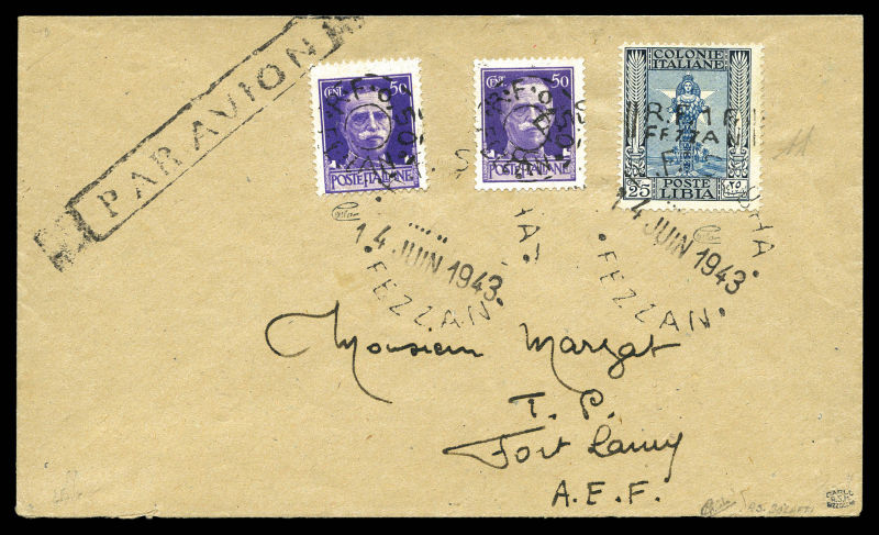 3160 imagePoste n°18 x 2ex et 19, 0.50 sur 50c violet et 1f sur 25c bleu et outremer obl du 14 juin 1943 sur lettre avec griffe 'PAR AVION' de SEBHA pour FORT LAMY. TTB. R. (signé Diena/Calves/certificats) Qualité: Oblitéré (Image) (image2) (image3) (All Images)