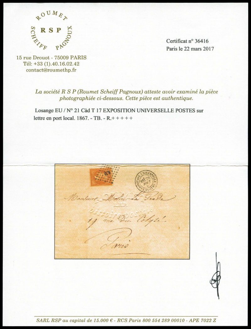 obl càd T17 EXPOSITION UNIVERSELLE POSTES sur lettre en port local. 1867. SUP. R. (certificats) Qualité: Oblitéré (Image) (image2)