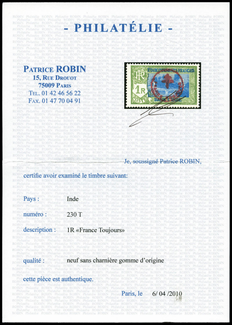 3360 imageN°230T, 'FRANCE TOUJOURS': 1 r vert-foncé et outremer. SUP (signé Brun/certificats) Qualité: ** Cote: 1900 euros (Image) (image2) (All Images)