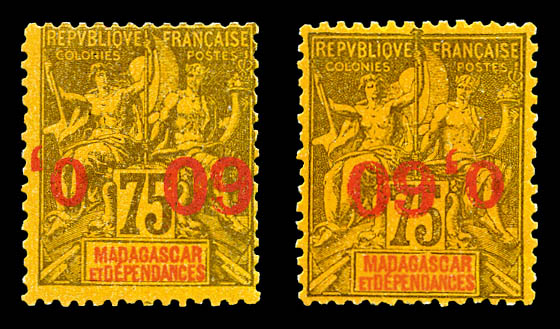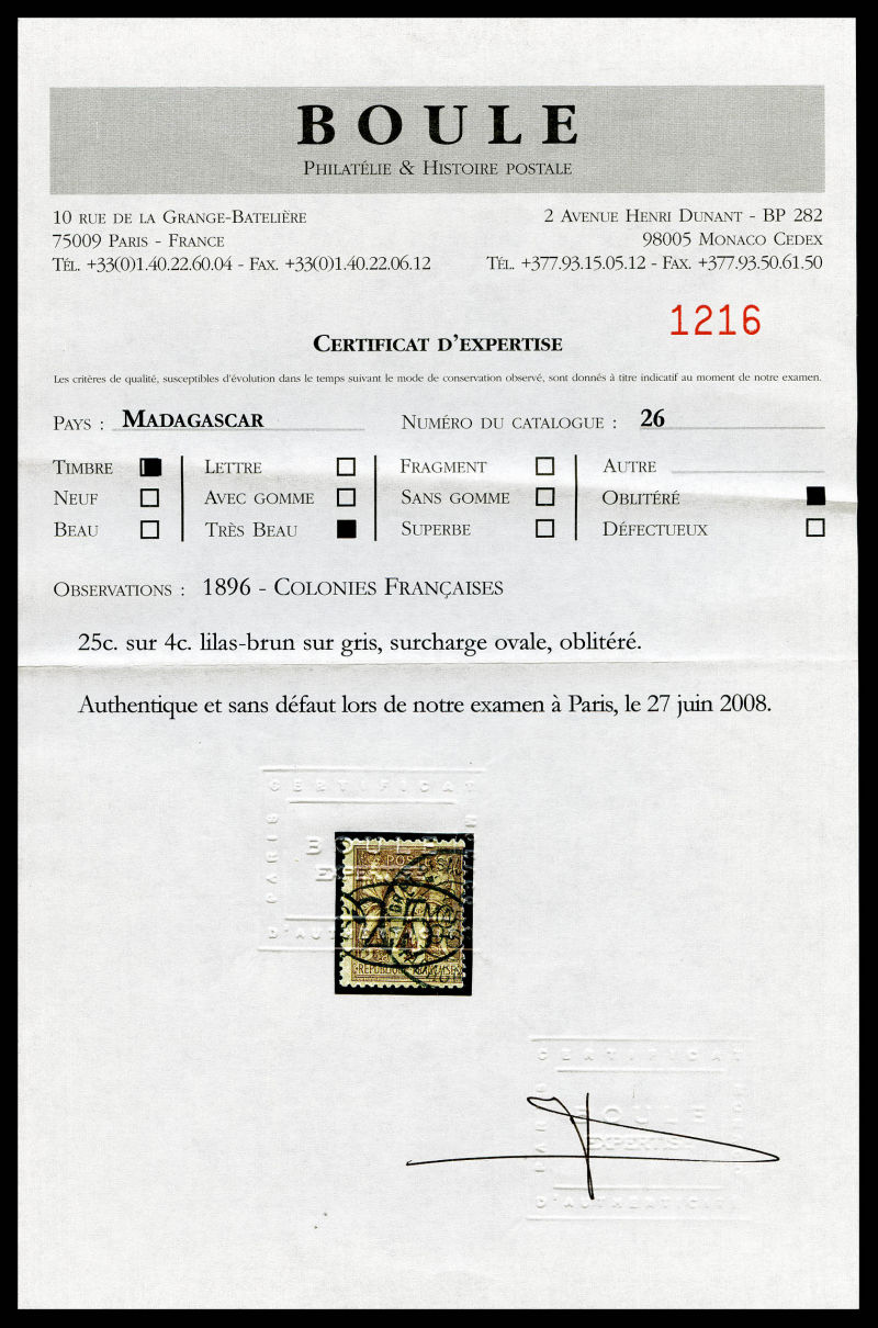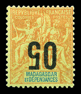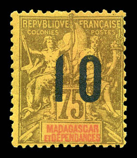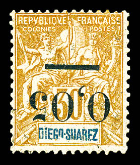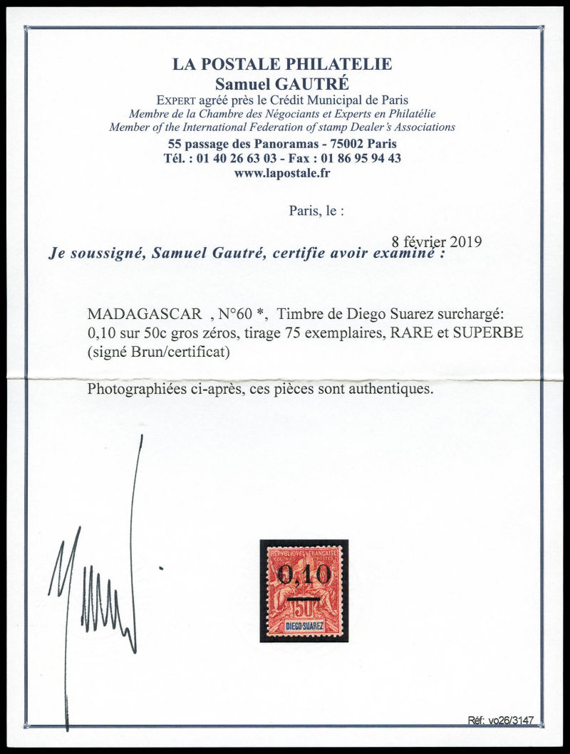 de Diego Suarez surchargé: 0,10 sur 50c gros zéros, tirage 75 exemplaires, RARE et SUPERBE (signé Brun/certificat) Qualité: * Cote: 7350 euros (Image) (image2)