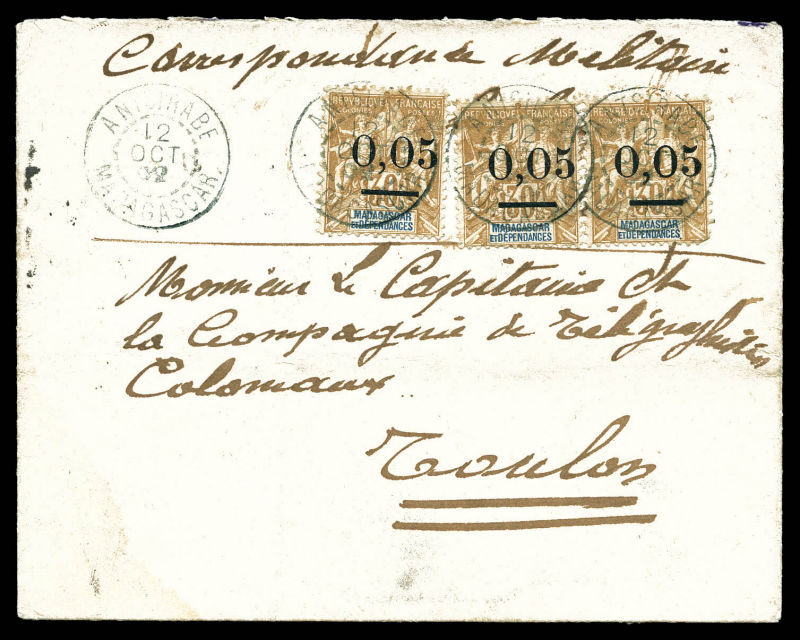 sur 30c brun (type II) x 3 exemplaires sur petite lettre avec mention 'correspondance Militaire' de ANISTRABE le 12 octobre 1902 pour Toulon. TTB (certificat) Qualité: Oblitéré