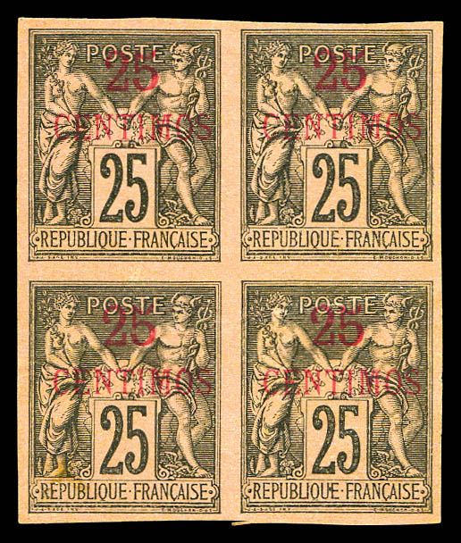 25 noir sur rose non dentelé en bloc de 4 (2ex pd), tjours sans gomme. TB Qualité: (*) Cote: 920 euros (Image)