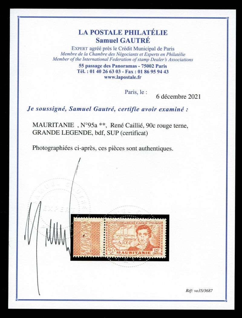 3550 imageN°95a, René Caillié, 90c rouge terne, GRANDE LEGENDE, bdf, SUP (certificat) Qualité: ** Cote: 785 euros (Image) (image2) (All Images)