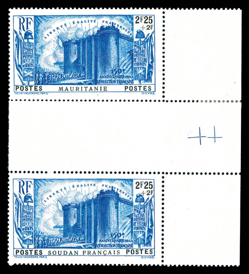3552 imageN°104a, 2f 25 + 2f bleu de MAURITANIE tenant à timbre du SOUDAN en paire interpanneau coin de feuille (chanière sur bdf). SUPERBE. R. (certificat) Qualité: ** Cote: 2100 euros (Image)