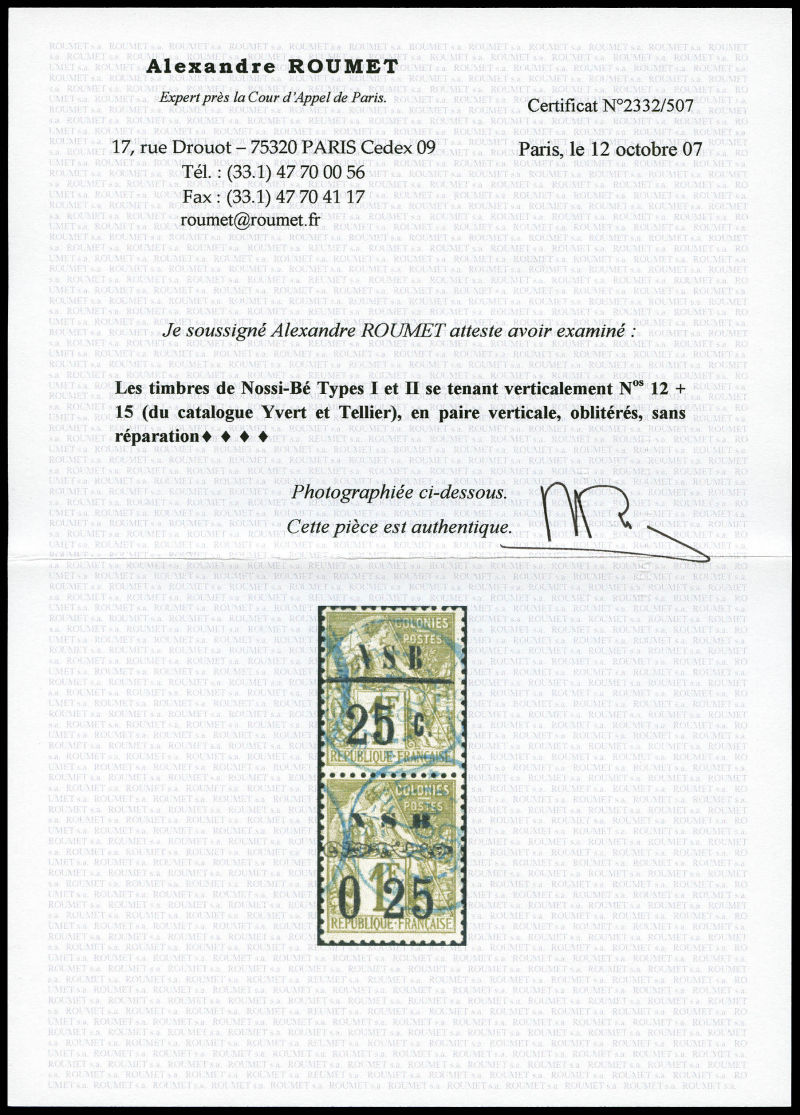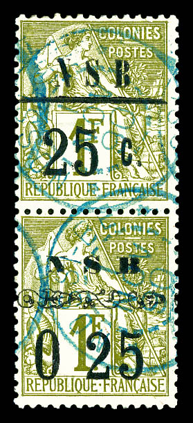 sur 1f olive, Type I et II se tenant verticalement. SUP (signé Brun/Robineau/certificats) Qualité: Oblitéré Cote: 780 euros (Image) (image2)