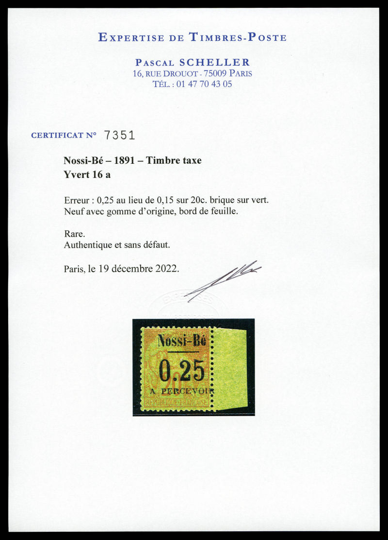 sur 20c brique sur vert. Erreur de valeur, bord de feuille latéral droit, fraîcheur postale. Il n'existe que 2 exemplaires neufs et 5 exemplaires oblitérés de ce timbre. SUPERBE. R.R.R. (signé Calves/Brun/certificats) Qualité: * Cote: 50000 euros (Image) (image2)