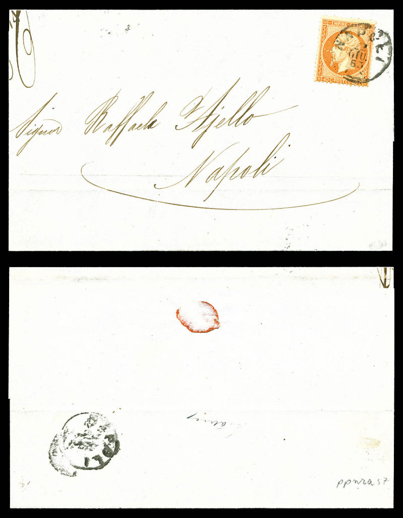 343 imageN°23, 40c orange obl GC italien '284' + griffe rouge AFFRANCHIE sur lettre de Marseille du 4 avril 68 pour Naples. Griffe (S.692) Piroscafi-Mercantili/Estero, arrivée le 8avr 68. SUP (certificat) Qualité: Oblitéré (Image)