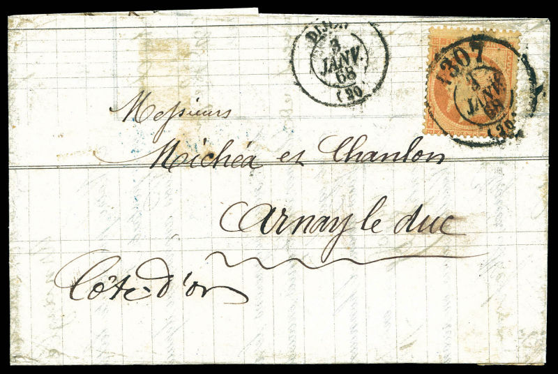 344 imageN°23, 40c orange obl càd Bureau de Passe 1307 du 3 janv 1868 + càd T15 Dijon sur lettre pour Arnay le Duc. TB Qualité: Oblitéré Cote: 375 euros (Image) (image2) (All Images)