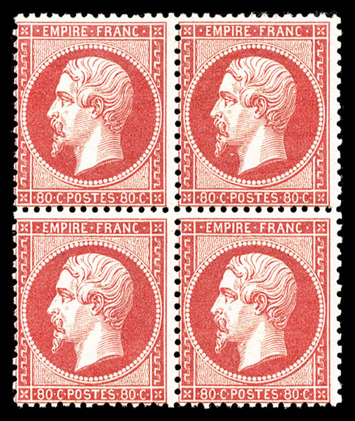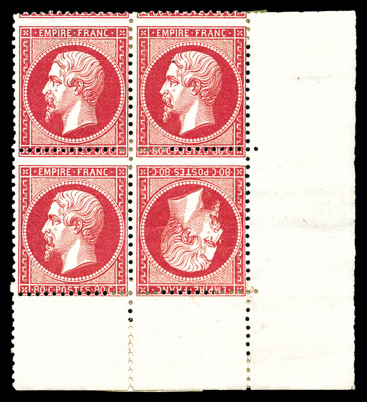 353 imageN°24b, 80c rose: TÊTE-BÊCHE tenant à normaux dans un bloc de quatre coin de feuille integral, très grande rareté de la philatélie francaise. SUP. R.R. (certificat) Qualité: * Cote: 37500 euros (Image)