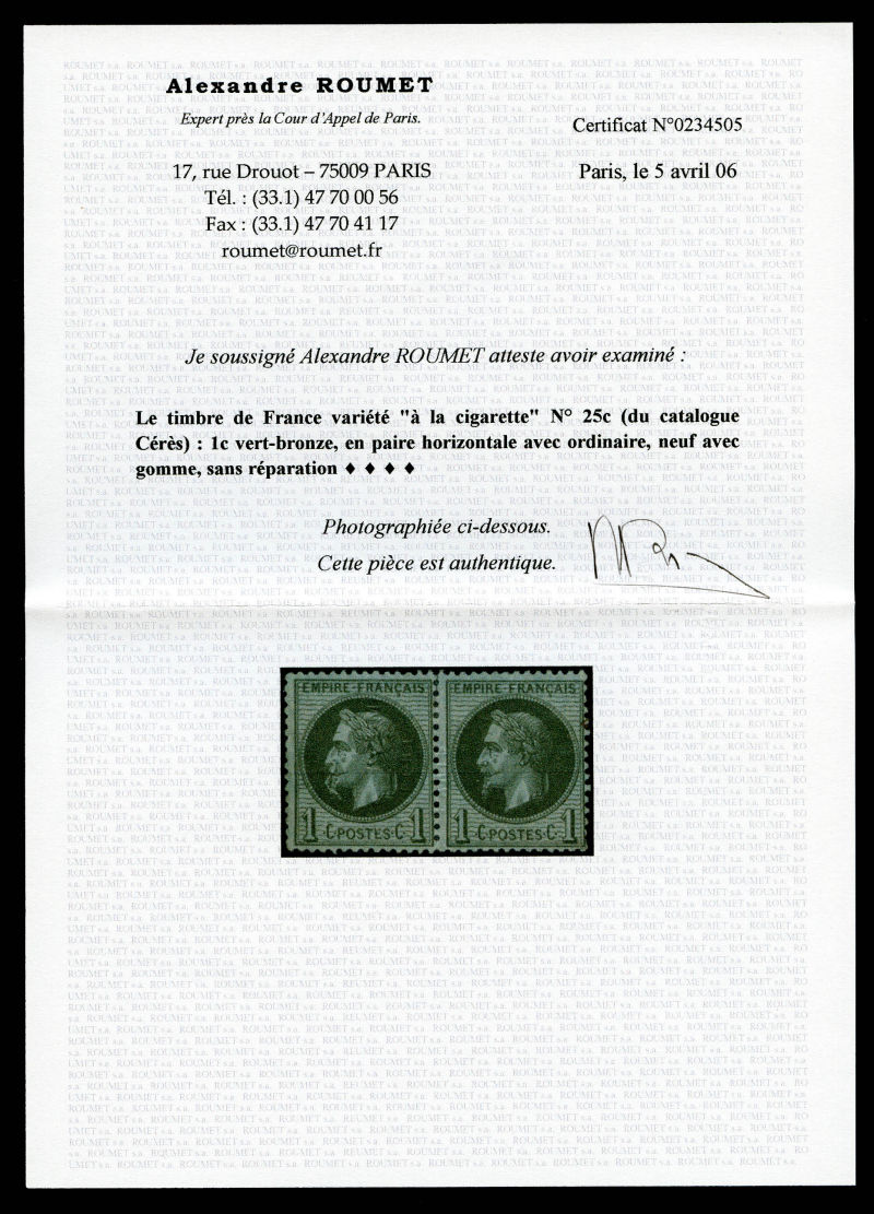 357 imageN°25b, 1c vert-bronze, variété à la cigarette tenant à normal, jolie pièce. TTB (signé/certificats) Qualité: * Cote: 3740 euros (Image) (image2) (All Images)