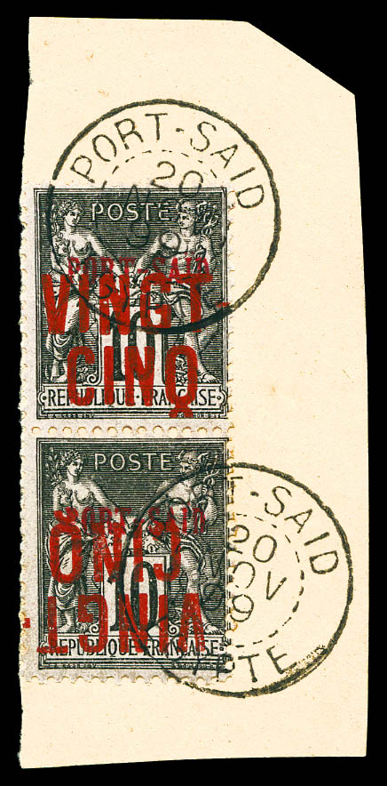 VINGT-CINQ sur 10c: surcharge renversée tenant à normal en paire verticale sur son support. TTB Qualité: Oblitéré (Image)