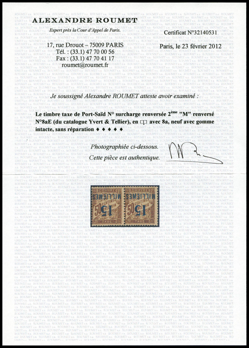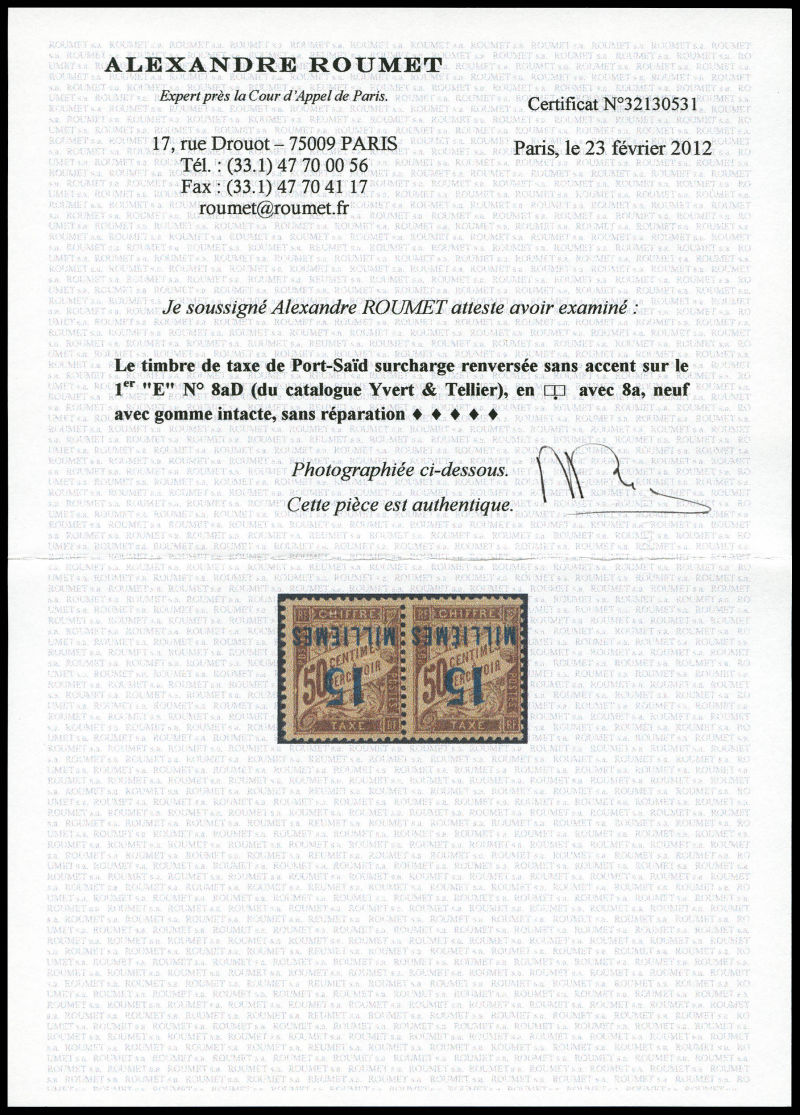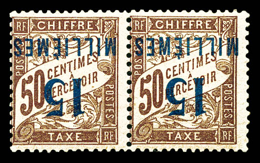 sur 50c lilas, surcharge renversée avec 'MILLIEMES' sans 'S' tenant à normal. SUP. R. (certificats) Qualité: ** Cote: 2550 euros (Image) (image2)