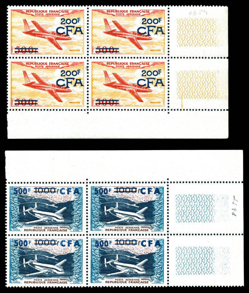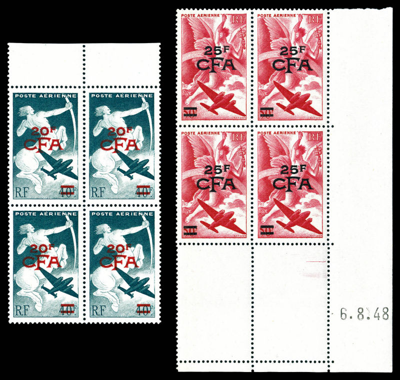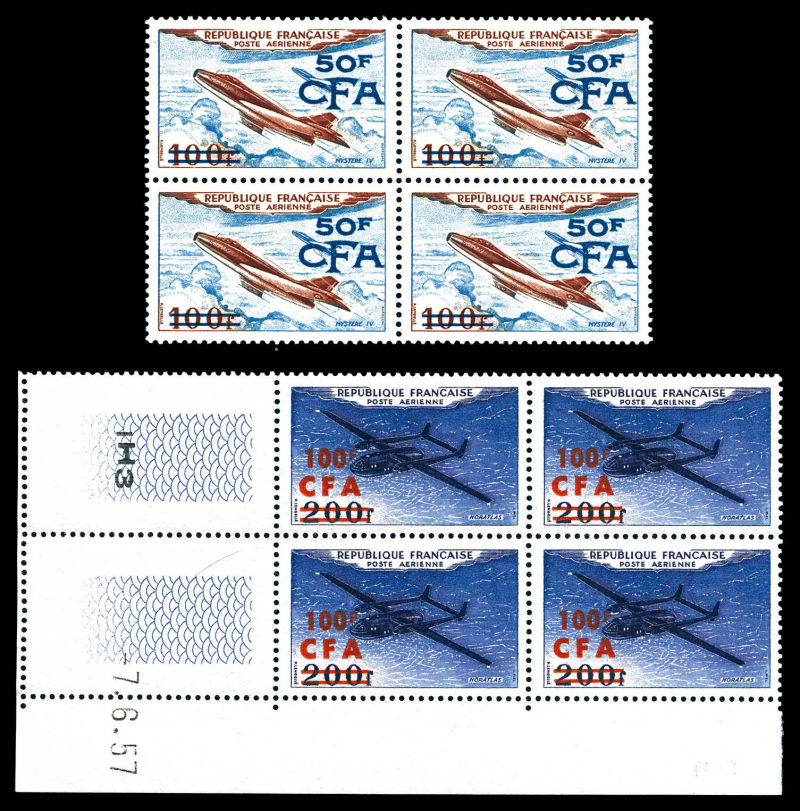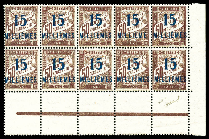 sur 50c lilas: surcharge 'MILLIEMES' sans 'S' et sans accent grave sur le 1er 'E' de 'MILLIEMES' tenant à normaux en bloc de 10 cdf. SUP (certificats) Qualité: ** Cote: 1915 euros (Image) (image2)