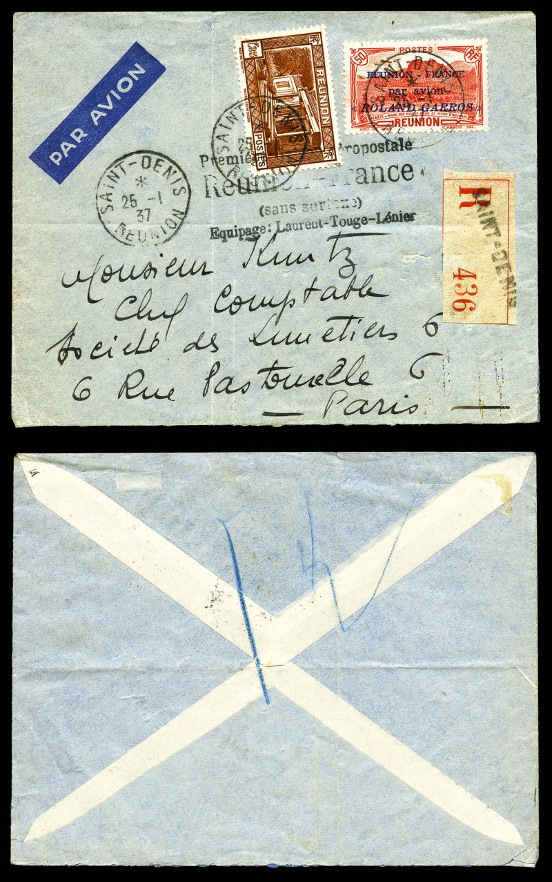 rouge surchargé 'Rolland Garros' (+N141) + griffe '1ère liaison aèropostale' sur lettre Recommandée de St Denis le 25 janv 37 pour Paris. TTB Qualité: Oblitéré