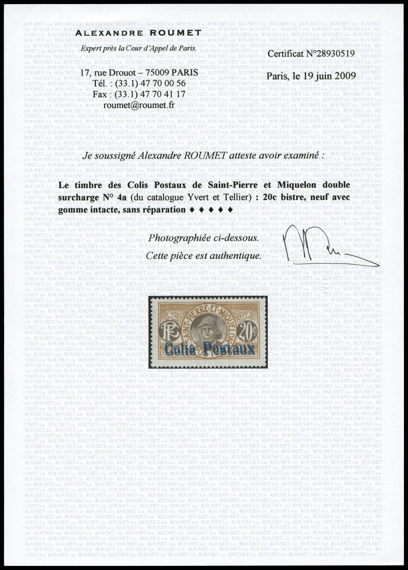 3871 imageN°4a, 20c bistre et brun-lilas, double surcharge, SUP (certificat) Qualité: ** Cote: 550 euros (Image) (image2) (All Images)
