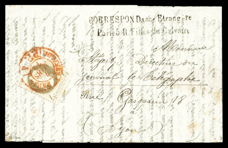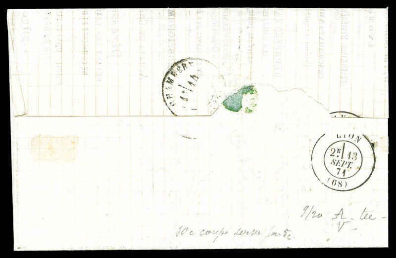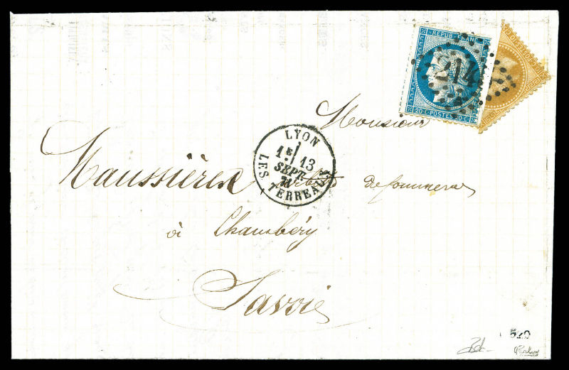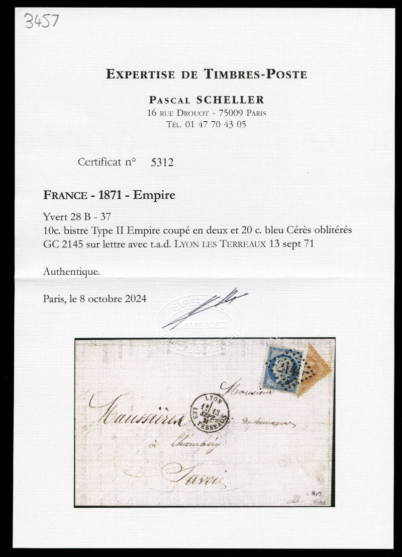 bistre type II coupé + 20c (N°37) obl GC 2145 sur lettre de LYON LES TERREAUX du 13 septembre 1871, arrivée à Chambery le 14 sept. SUP. R.R. (signé Calves/certificats) Qualité: Oblitéré Cote: 8500 euros (Image) (image2)