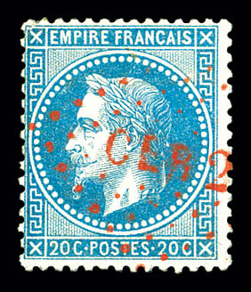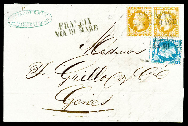 (n°28) + 20c Lauré (n°29) obl 'FRANCIA VIA DI MARE' sur lettre de Marseille pour Gènes (signé Calves) Qualité: Oblitéré (Image)