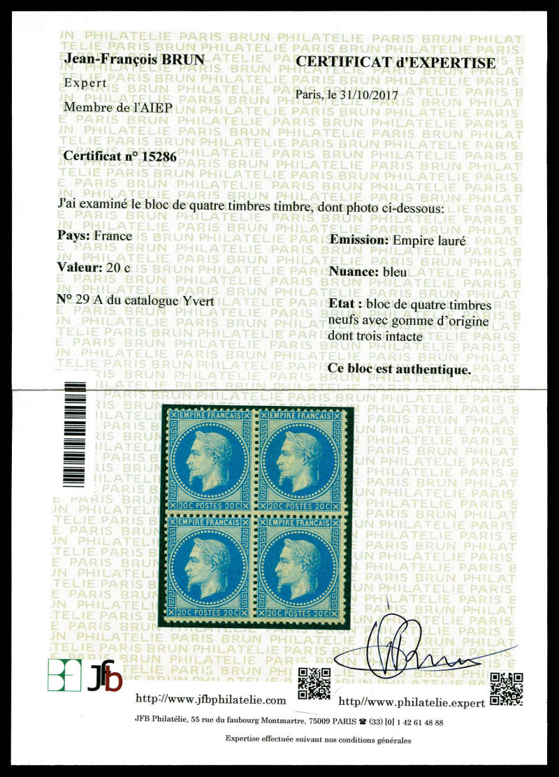 type I en bloc de quatre (2ex*), fraîcheur postale. SUP (signé Brun/certificats) Qualité: ** (Image)
