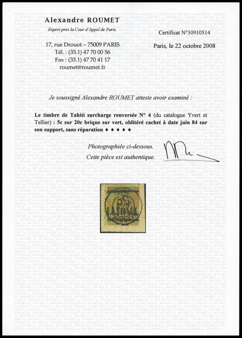 4017 imageN°4a, 5c sur 20c, surcharge renversée sur son support. SUP (certificats) Qualité: Oblitéré Cote: 465 euros (Image) (image2) (All Images)