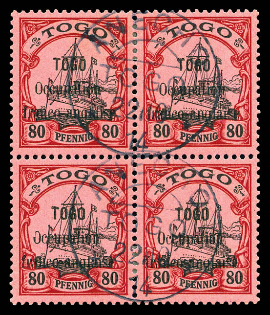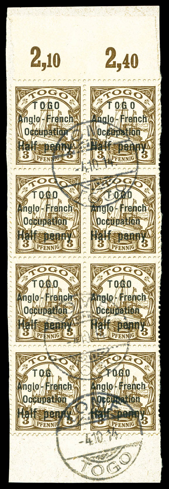4077 imageN°31Ab, 1/2 pfennig sur 3 pfennig, variété 'TOG' au lieu de TOGO tenant à normaux en bloc de 8 haut de feuille obl càd de 'Lomé Togo' du 4 oct 1914. TTB (certificat) Qualité: Oblitéré Cote: 1475 euros (Image)