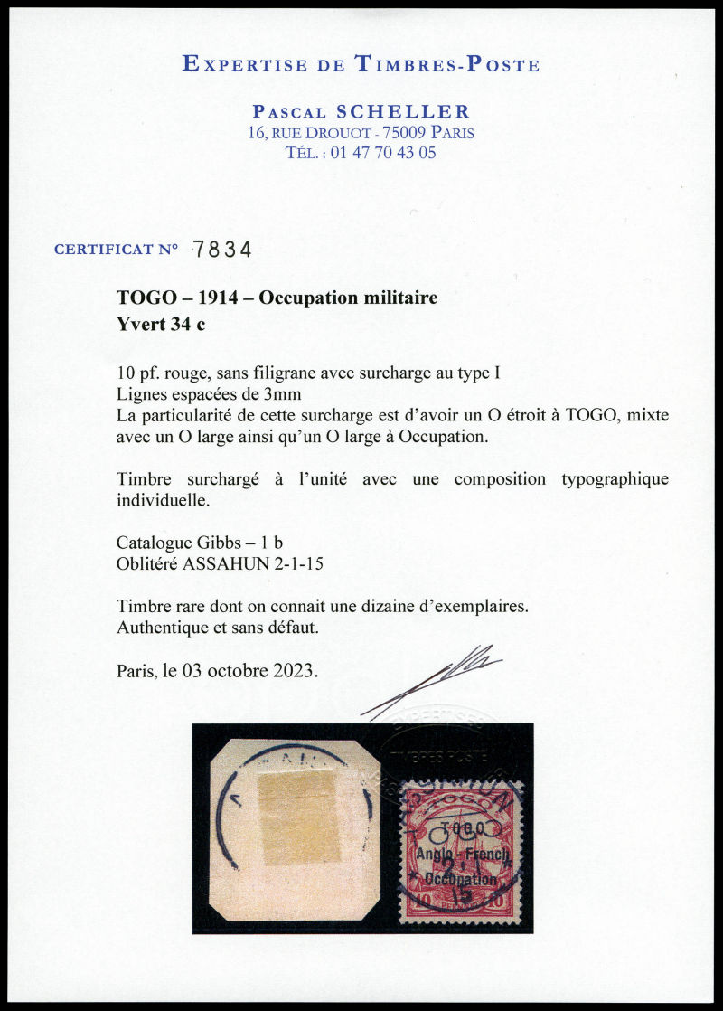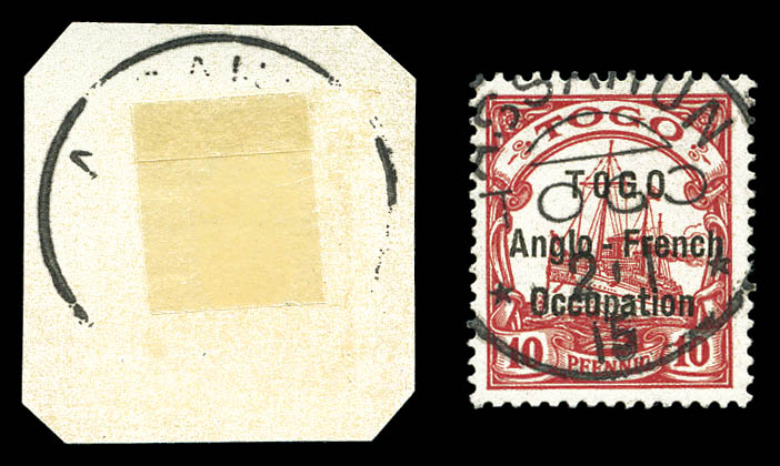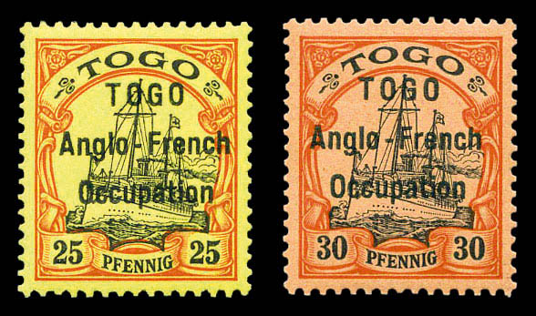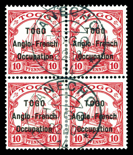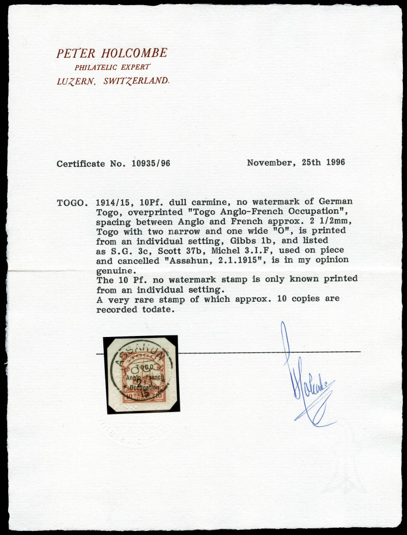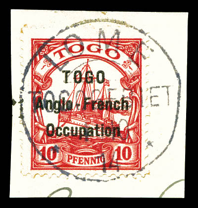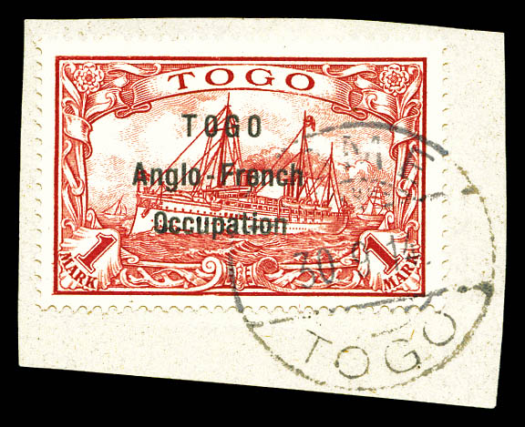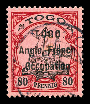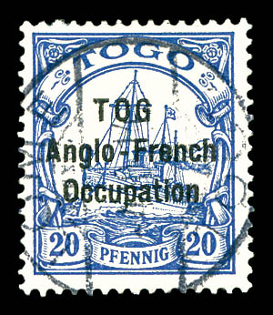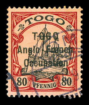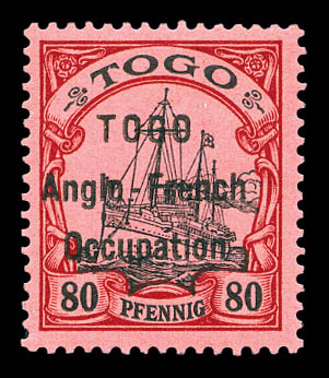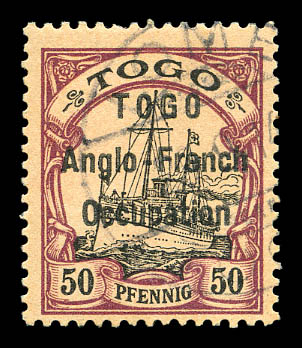 lilas-pourpre et noir sur chamois avec surcharge au type I. Ligne espacées de 3 mm. Variété: Deux 'O' étroits à TOGO et 'O' large à Occupation. Position 30 de la composition typographique de 50. Probablement unique. SUPERBE. R.R.R. (certificats)