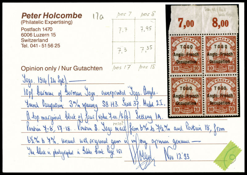 sur 5 pf Type II: variété 'TOG' au lieu de 'TOGO' tenant à normaux au centre d'un bloc de 9 bas de feuille. SUP (certificat) Qualité: ** Cote: 1745 euros (Image)