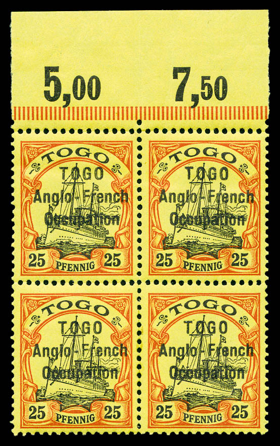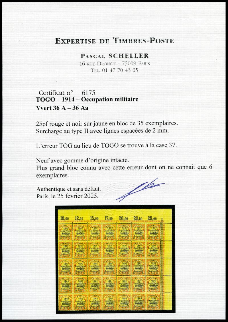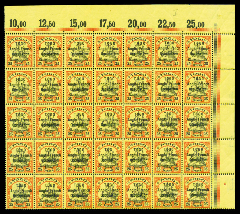 pfennig rouge et noir sur jaune Type II: 'TOG' au lieu de 'TOGO' (case 37) tenant à normaux en bloc de 37 exemplaires coin de feuille. On ne connait que 6 exemplaires de cette variété. SUPERBE. R.R.R. (certificats) Qualité: ** Cote: 57640 euros (Image) (image2)