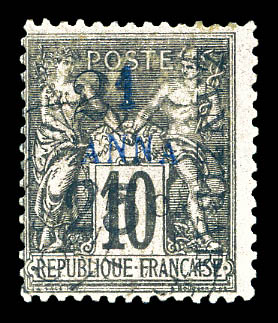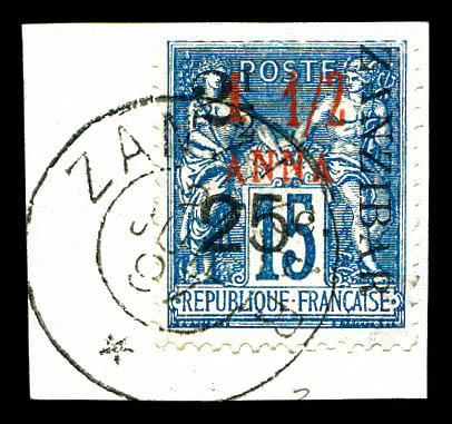4140 imageN°58a, 25c et 2 1/2 sur 4 annas. sur 40c rouge-orange, SURCHARGE 'f' au lieu de 'c' oblitéré sur son support. SUPERBE. R.R. (signé Calves/Gilbert/Margues/certificats) Qualité: Oblitéré Cote: 6750 euros (Image) (image2) (All Images)