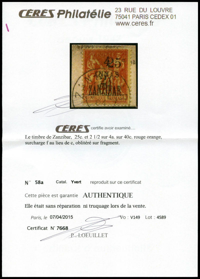 4139 imageN°58, 25c et 2 1/2 sur 4 annas sur 40c, sur son support. SUP. R.R. (signé Scheller/certificat) Qualité: Oblitéré Cote: 1350 euros (Image)