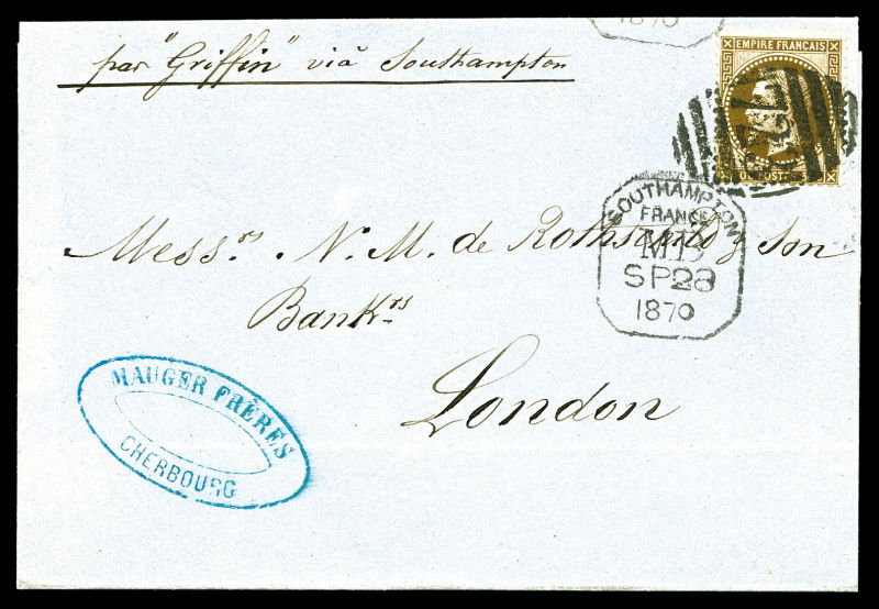 obl obl càd Anglais '723' + cachet de SOUTHAMPTON du 26 sept 70 sur lettre de CHERBOURG pour LONDRES, arrivée au verso. SUP. R. (certificats) Qualité: Oblitéré Cote: 2000 euros
