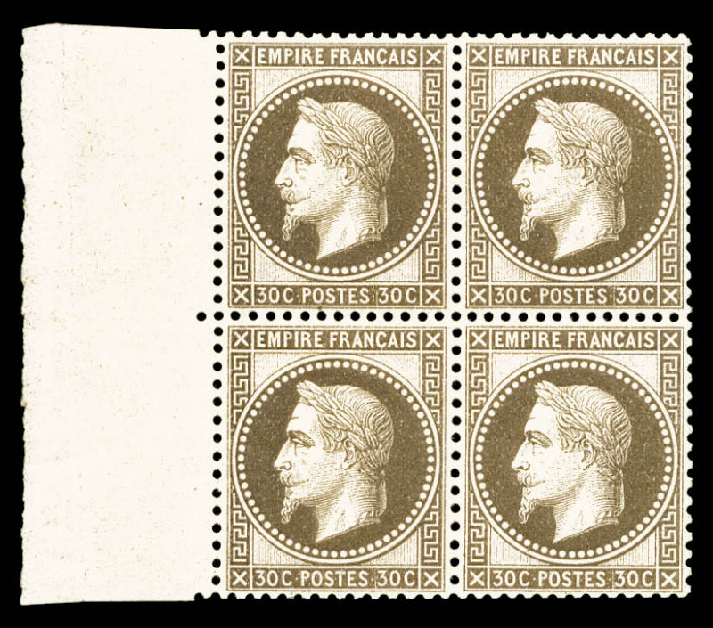 foncé, bloc de quatre bord de feuille latéral gauche, centrage parfait, fraîcheur postale. PIECE EXCEPTIONNELLE. R.R.R. (signé Margues/Calves/certificat) Qualité: **