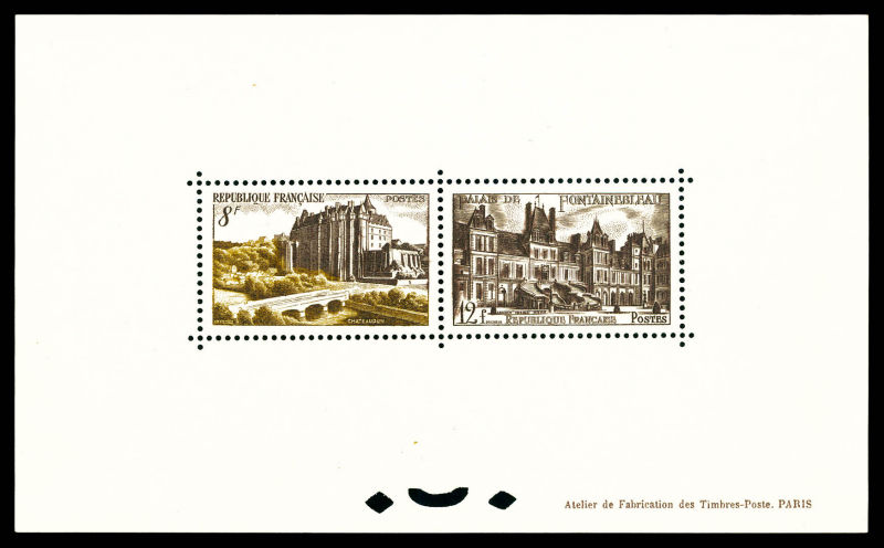 Château de Chateaudun et Château de Fontainebleau. Epreuve de présentation en noir datée du 21.12.50 du grand bloc gommé (même format) avec perforations de contrôle dessinées. 2 à 5 blocs possibles. SUPERBE. R.R.R (certificat) Qualité: ** (Image)