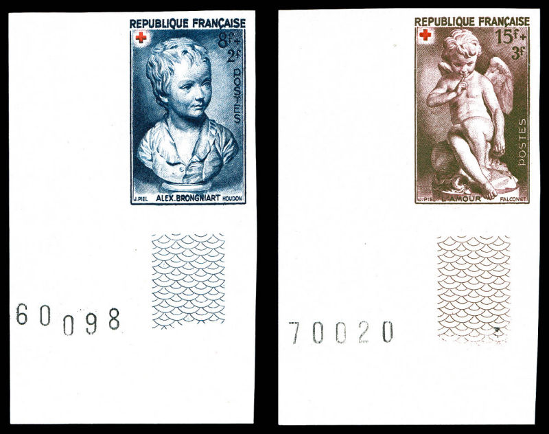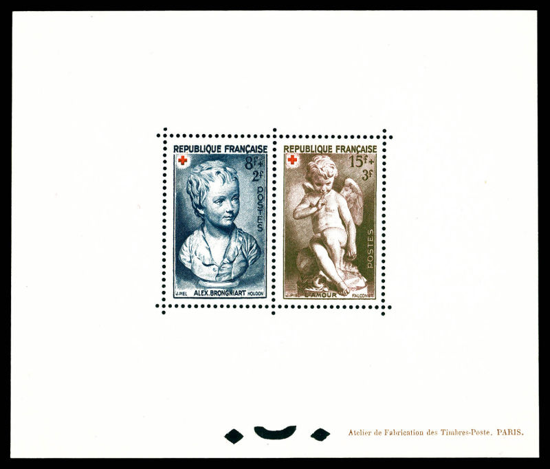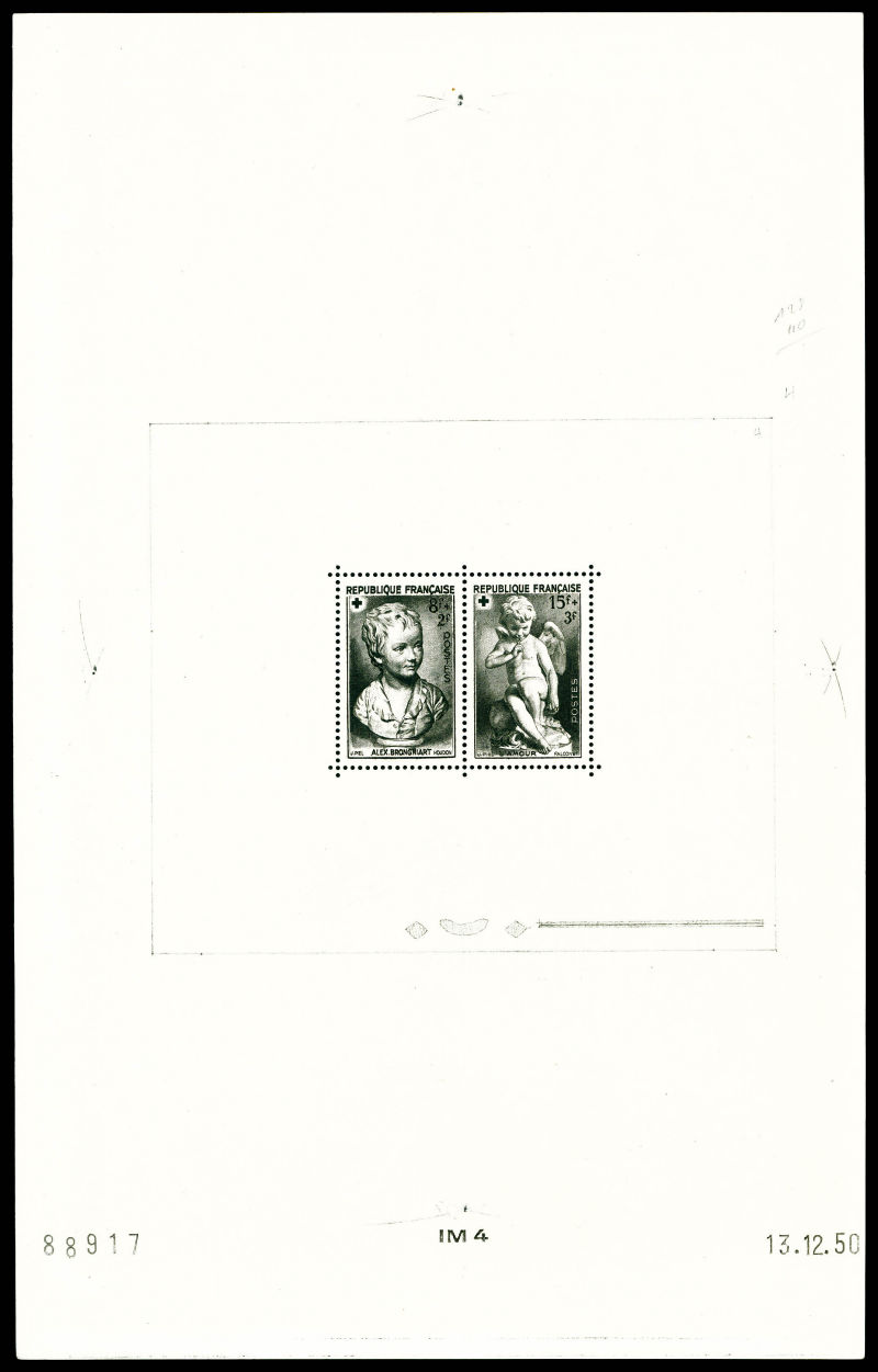 Blocs Spéciaux, Paire Croix rouge de 1950. Epreuve de présentation en noir datée du 13.12.50 du grand bloc gommé (même format) avec perforations de contrôle dessinées. 2 à 5 blocs possibles. SUPERBE. R.R.R (signé Calves/certificats) Qualité: ** (Image)