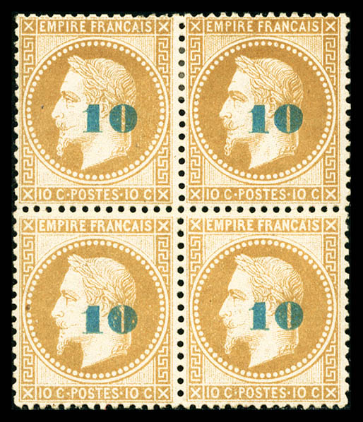 442 imageN°34a, Non émis, 10c sur 10c bistre surcharge bleu pâle en bloc de quatre (2ex*), fraîcheur postale, très bon centrage. SUPERBE. R.R.R. (certificat) Qualité: ** (Image)